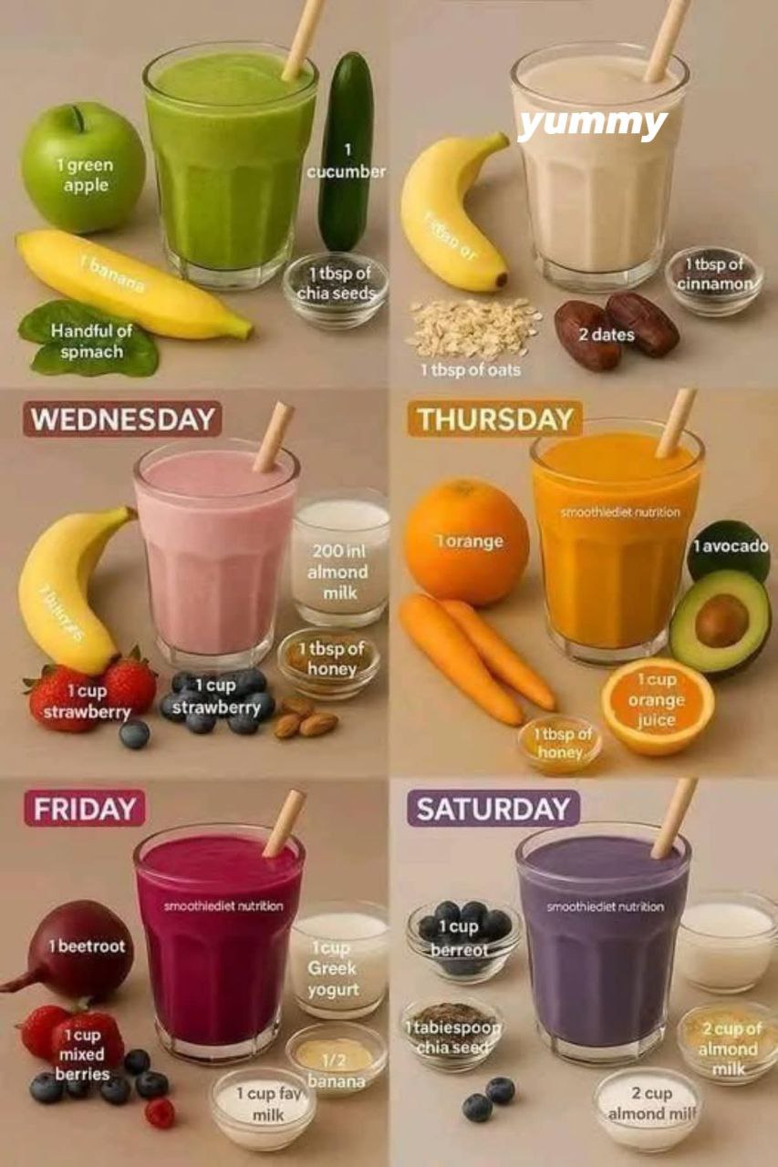 This 6-day smoothie plan combines fruits, vegetables, seeds, and superfoods to support energy, digestion, immunity, and overall vitality. Each day of the week brings a new flavor profile and unique health benefits—all in one glass.