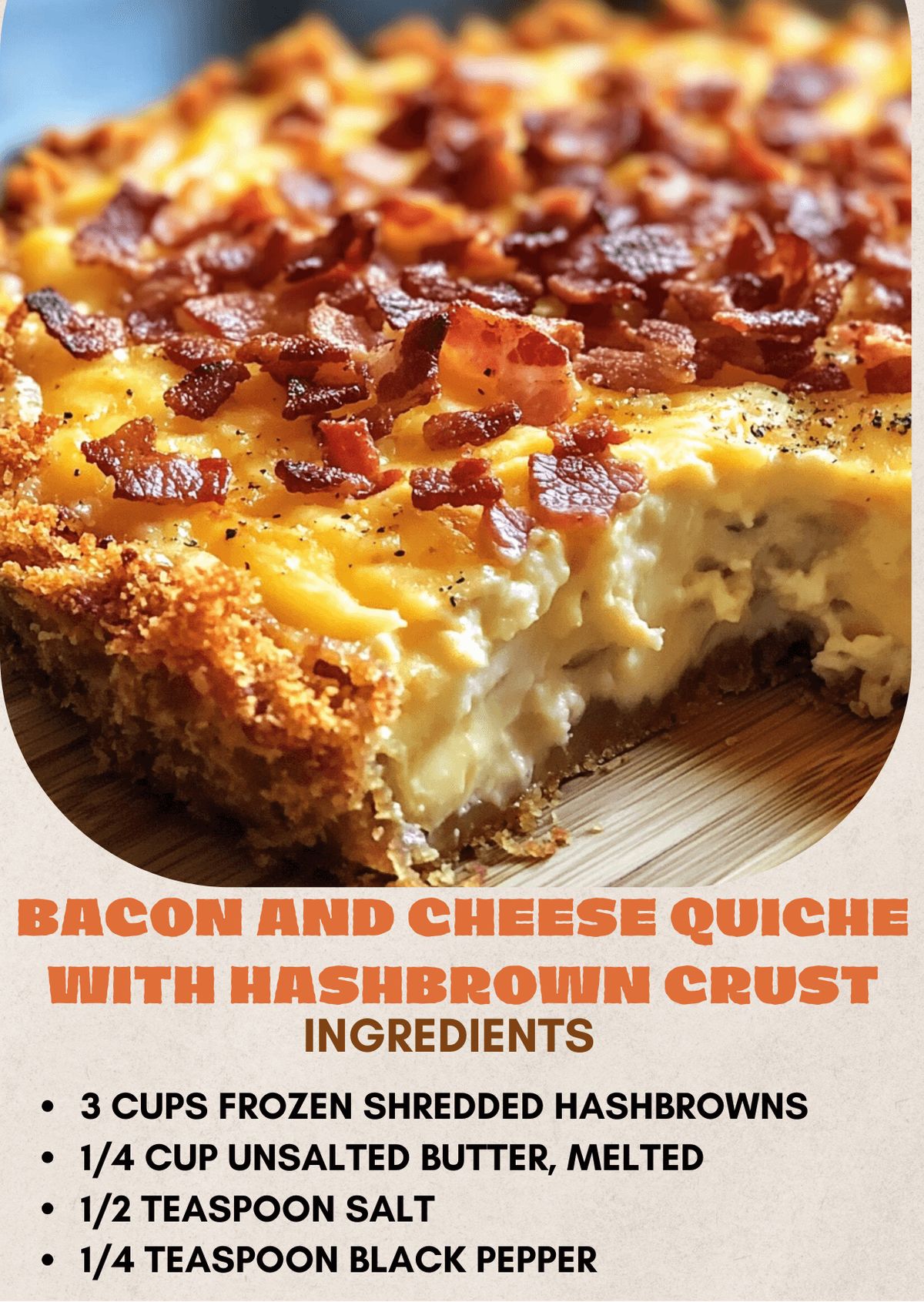 This recipe is a game-changer for brunch lovers! ๐ฅ๐ง๐ฅ A Bacon and Cheese Quiche with Hashbrown Crust combines crispy potatoes, savory bacon, and creamy eggs into one irresistible dish. Here’s how to make it: