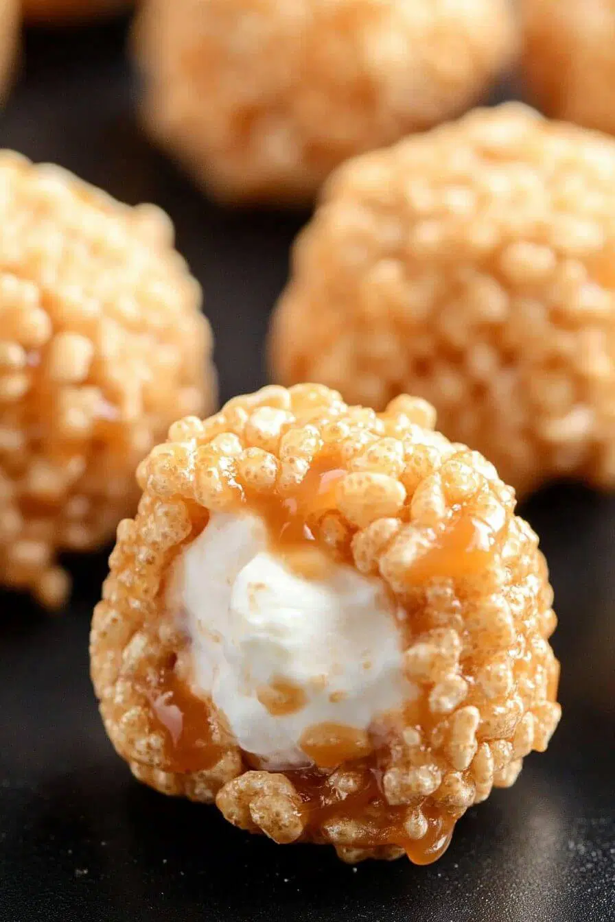 Caramel Marshmallow Rice Krispie BallsThis recipe uses gooey caramel, marshmallows, and Rice Krispies cereal to create a chewy, crunchy, insanely addicting treat. They’re bite-sized, easy to whip up and make the perfect party, holiday or unattended-for-too-long treat.
