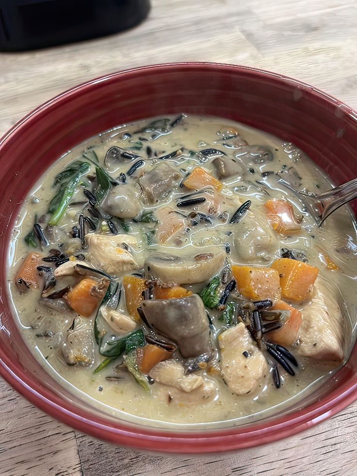 Ingredients:Chicken breast (cubed)Carrots (chopped)Mushrooms (sliced)Spinach or other leafy greensWild rice (cooked or parboiled)Chicken brothHeavy cream or milkGarlic, onion, salt, pepper, thyme (optional)