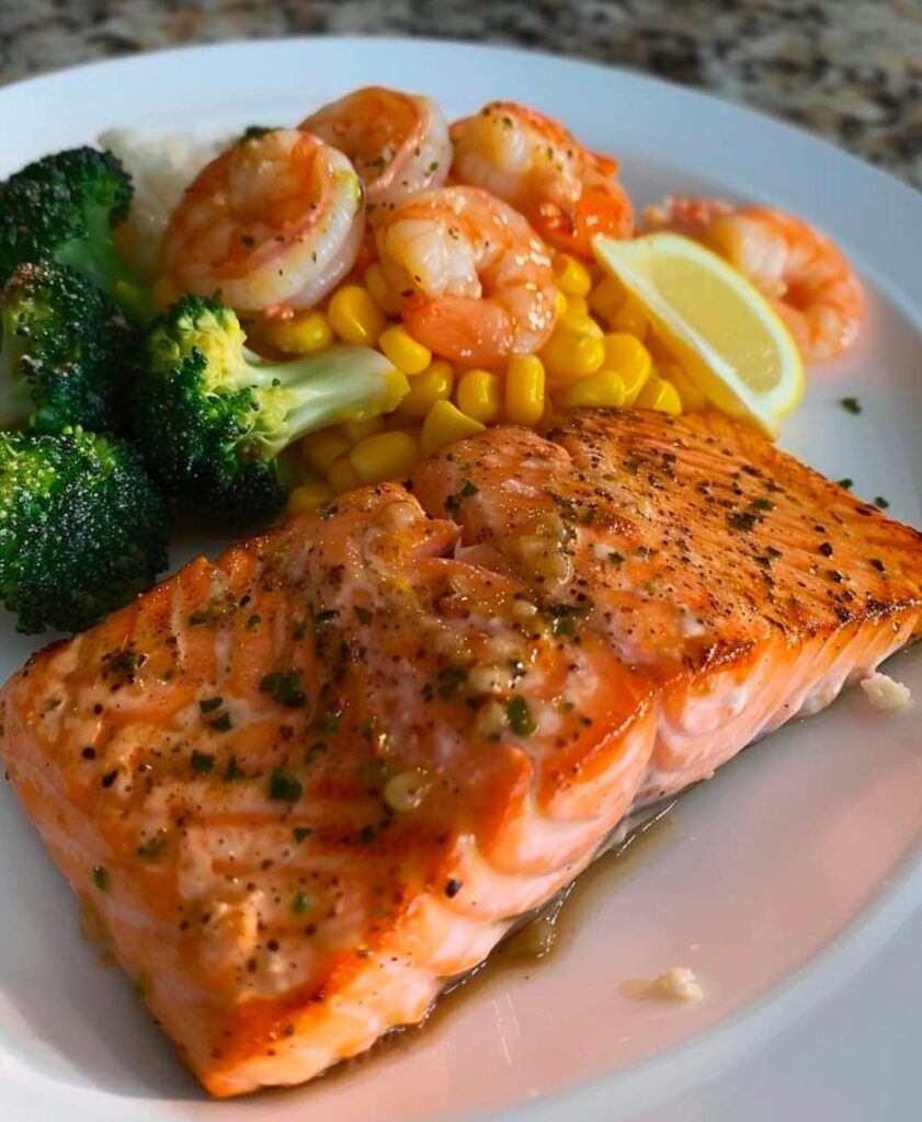 Salmon, Shrimp, Cheesy Broccoli with Corn Ingredients: For the Salmon and Shrimp: 4 salmon fillets, about 6 oz each 1 lb shrimp, peeled and deveined 2 tablespoons olive oil Salt …