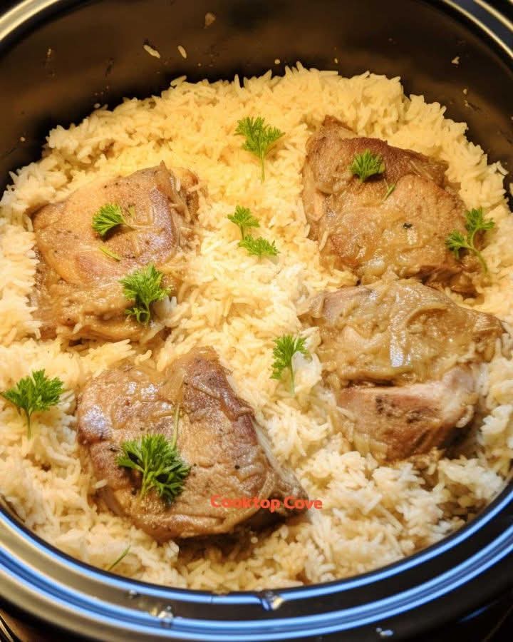 Slow Cooker Pork Chops & Rice melds the succulence of bone-in pork chops with the heartiness of rice into a comforting, no-fuss meal—all made in the ease of a slow cooker. This dish is a humble, classic meal that likely doesn’t have a single point of origin but rather evolved in kitchens around the world as people found the slow cooker a convenient way to prepare tender meat and flavorful rice without having to stand over the stove. It’s a popular choice for busy days, and pork chops being a staple in many cultures, serve as a familiar and satisfying centerpiece for a family dinner.