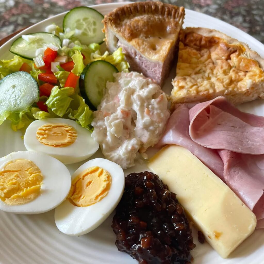 🧾 Ingredients Hard-boiled eggs, sliced Cooked ham slices Chunk of cheese (usually Cheddar) Branston pickle or chutney Coleslaw Pork pie Quiche slice Side salad: Lettuce Cucumber Red bell pepper Onion …