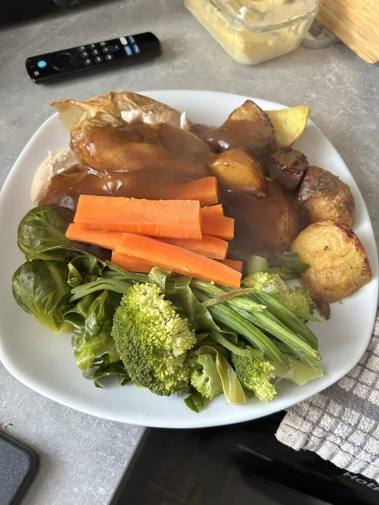 Ingredients : Roast chicken (or beef/lamb/turkey) Roast potatoes Steamed vegetables: Carrots Broccoli Leeks Brussels sprouts Gravy Optional (not shown here): Yorkshire pudding, stuffing, peas, or parsnips.