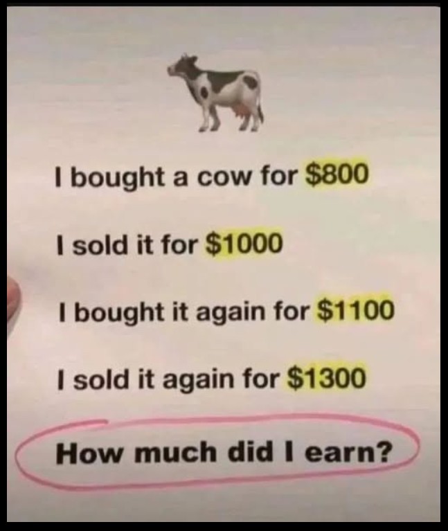 Finally, you sell the cow again for $1,300 → Profit: $200