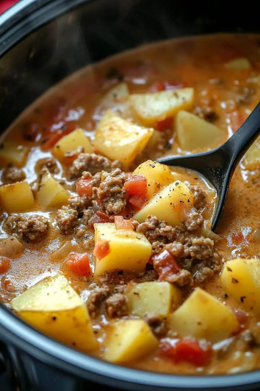This Creamy Potato & Hamburger Soup makes for the ultimate slow-cooked comfort food on cold winter days! This rich, flavorful and satisfying soup is made with tender potatoes, hearty ground beef, and a velvety cheese-infused broth. Chock-full of vegetables and flavored with dried herbs, it’s a healthful, one-pot dinner that’s just as simple to make as it is to eat.