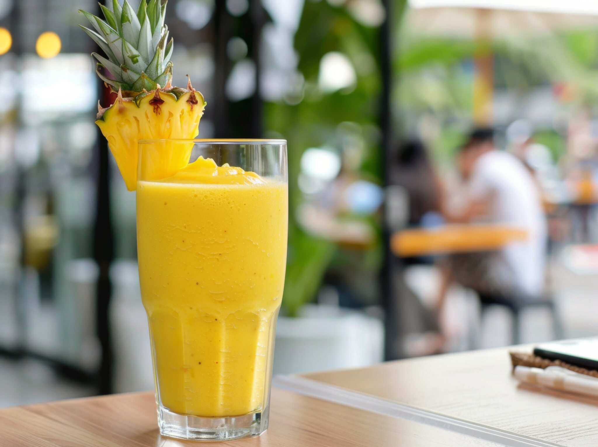 1 cup chopped pineapple1 ripe banana (cut)½ cup yogurt (natural/vanilla)½ cup milk (any type)1 tbsp honey/sugar (optional)Ice cubes