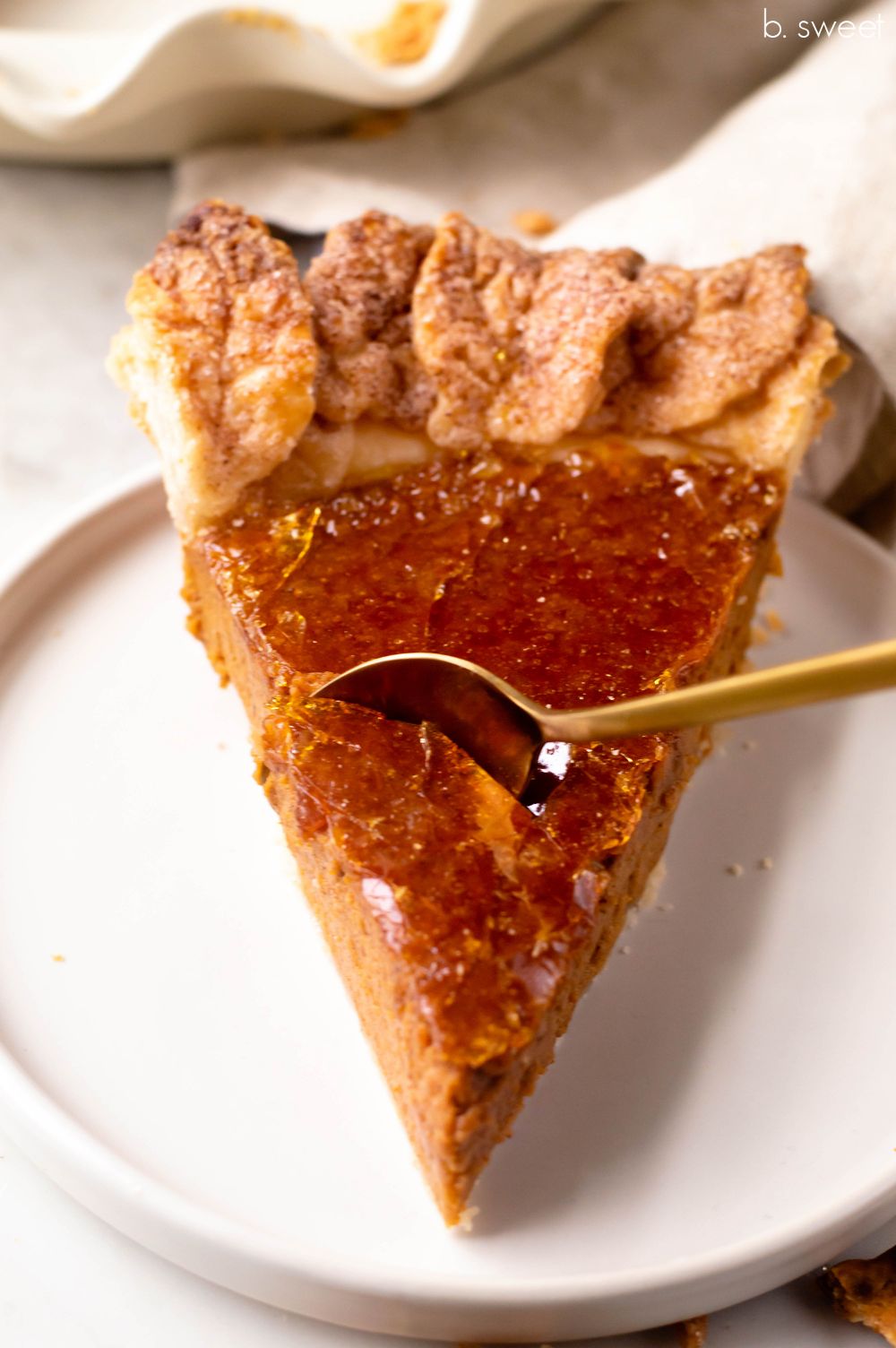 4. Brûlée the top: Sprinkle a thin, even layer of sugar over the chilled pie. Use a kitchen torch to caramelize the sugar until golden and crisp. If you don’t have a torch, place under a broiler briefly — watch closely to avoid burning.
