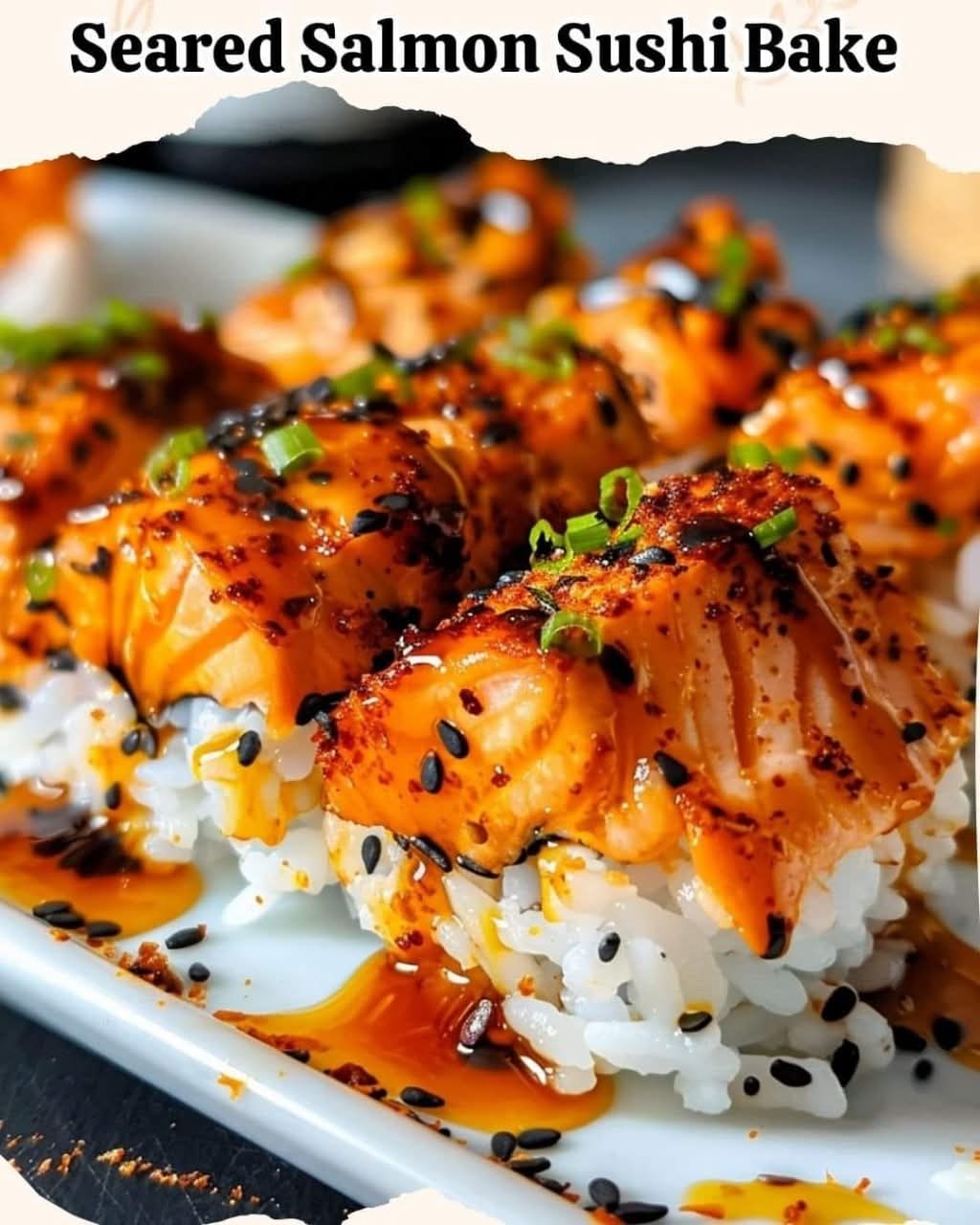 Arrange the flaked salmon over the sushi rice in the baking dish. Pour the soy sauce mixture evenly over the salmon.
