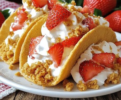 - These are dessert tacos featuring crispy taco shells filled with creamy cheesecake and topped with fresh strawberries and graham cracker crumbs.