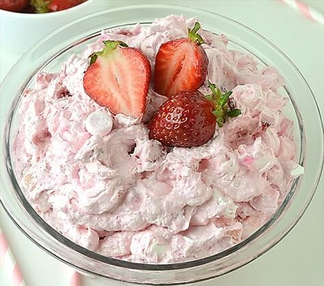 It’s a sweet, creamy salad made with fresh strawberries, whipped cream, marshmallows, and pudding mix—a delightful blend of dessert and side dish.